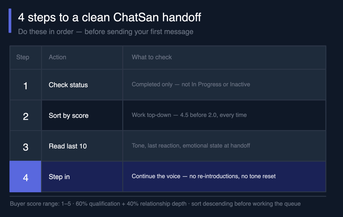 When a chatter takes over a ChatSan conversation, there's one rule that determines whether they close or lose the lead. Read the last 10 messages before sending anything. That's it. Everything else builds from there.