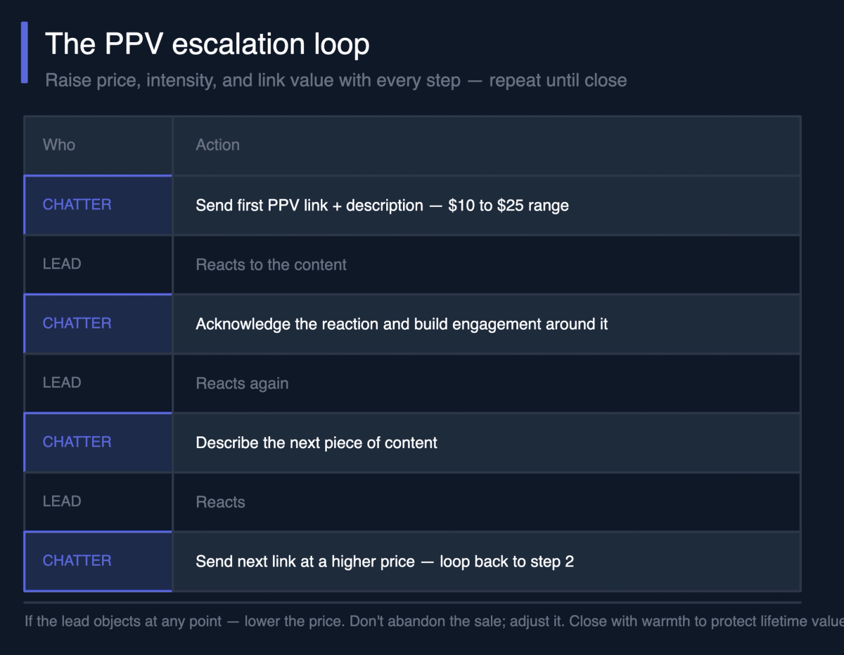 Once you've re-engaged the lead and re-established conversational warmth, the PPV selling phase follows an escalation loop.